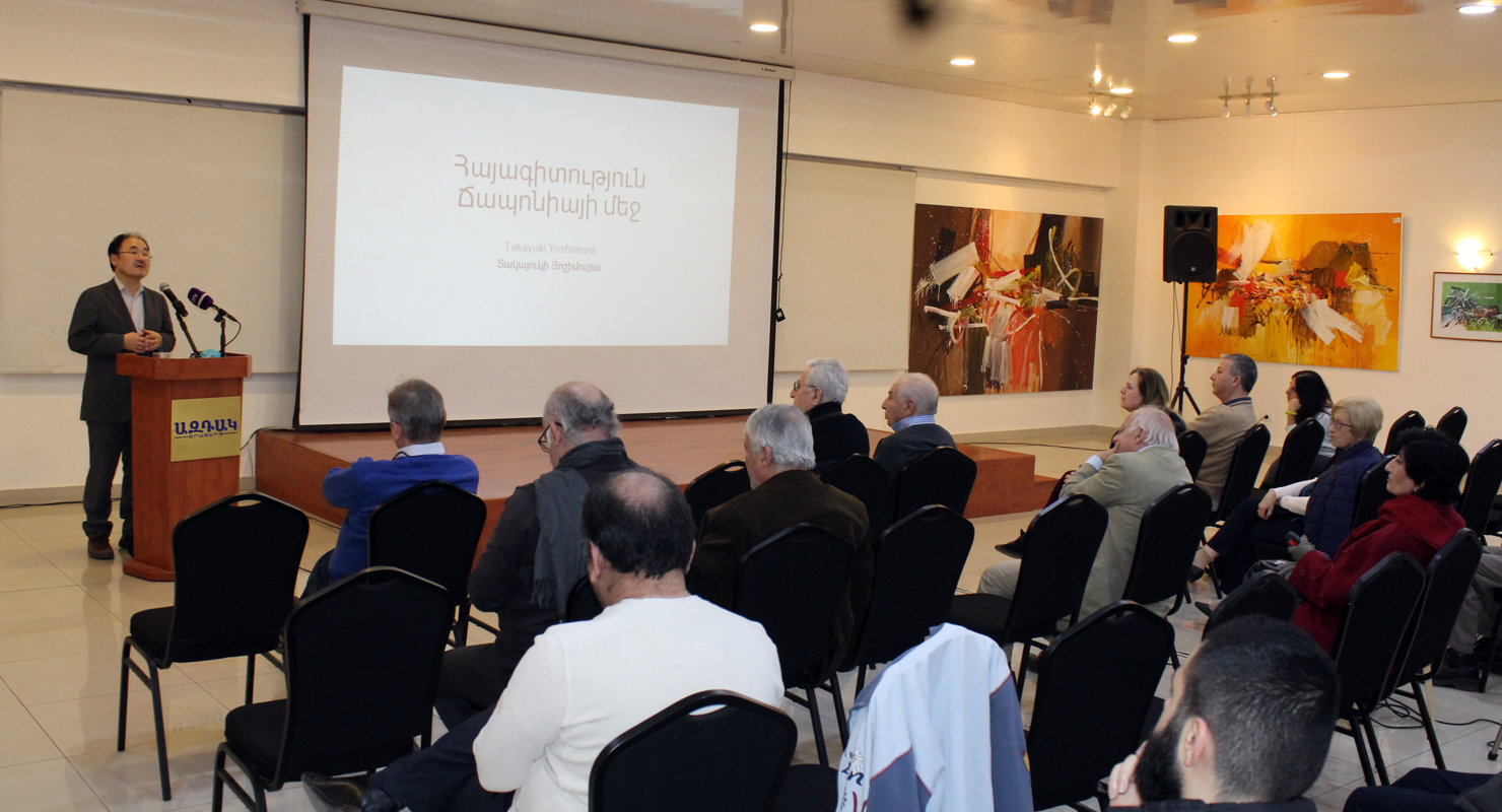 Դոկտ. Թաքայուքի Եոշիմուրա սահիկներու ցուցադրութեան ընդմէջէն ներկայացուց հայագիտութեան պարզած վիճակը Ճափոնի մէջ: Ան ըսաւ, որ իր պաշտօնավարած համալսարանին մէջ առանձին հայագիտութեան ամպիոն չկայ, բայց տարբեր մասնագիտութիւններու հետեւող ուսանողներ, ըստ իրենց նախասիրութեան, կու գան եւ կը հետեւին հայոց լեզուի եւ հայոց պատմութեան դասընթացքներուն: Երեւանի մէջ իր ուսումնառութենէն ետք, Թաքայուքի Եոշիմուրա խանդավառութենէ մեկնելով Թոքիոյի մէջ կազմակերպած է արեւելահայերէնի առաջին խտացեալ արագ դասընթացքը, եւ այսպէս, ամէն տարի կ՛ունենայ 8-10 ճափոնցի ուսանող, որոնք կը հետաքրքրուին հայոց լեզուով եւ հայ մշակոյթով: Անկախ ասկէ, Թաքայուքի Եոշիմուրա գրած է նաեւ գիտական յօդուած` ժամանակակից հայոց պատմութեան մասին:
