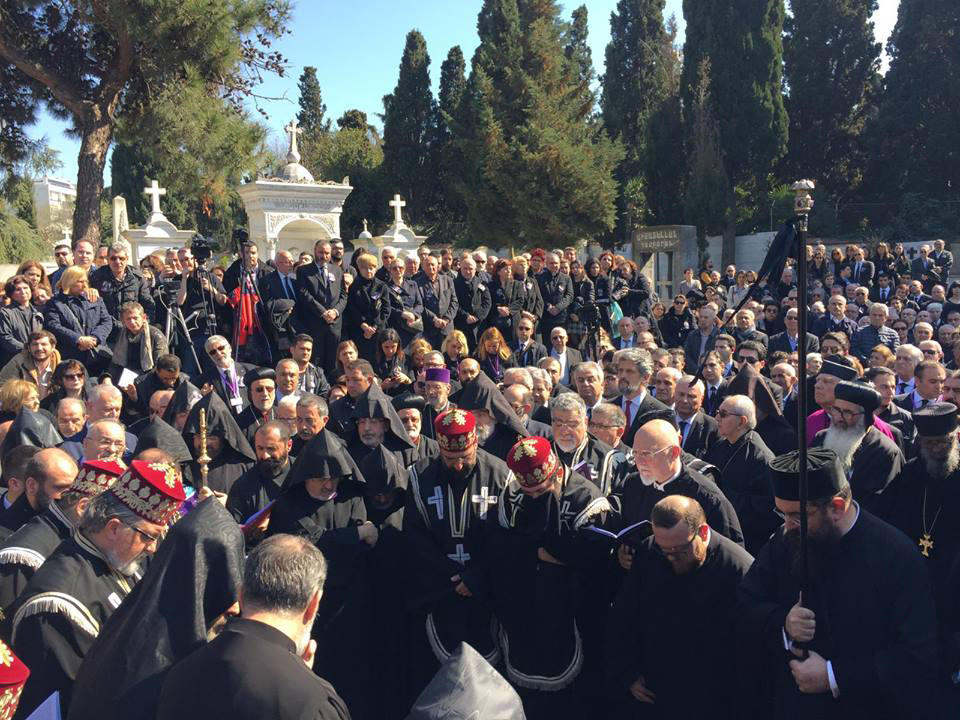 Այնուհետեւ հսկայ թափօրը ուղղուեցաւ դէպի գերեզմանատուն, ուր եւս ասեղ ձգելու տեղ չկար: Հոս, հոգեյոյզ մթնոլորտի մէջ կատարուած աղօթքներէն ետք, վերջին օծումը կատարեց Երուսաղէմի հայոց պատրիարք Նուրհան արք. Մանուկեանը: