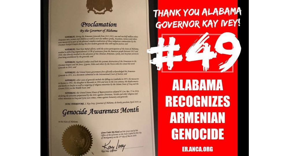 Միացեալ Նահանգներու Ալապամա նահանգի ղեկավար Քոյ Իվին ստորագրած է հռչակագիր մը` Հայոց ցեղասպանութիւնը ճանչնալու վերաբերեալ: Այս մասին կը յայտնէ Ամերիկայի Հայ դատի յանձնախումբը` շնորհակալութիւն յայտնելով նահանգապետի որոշումին համար:
