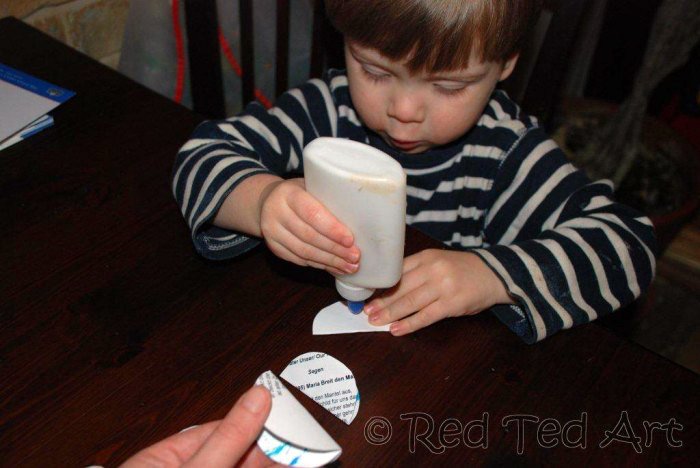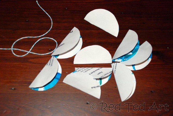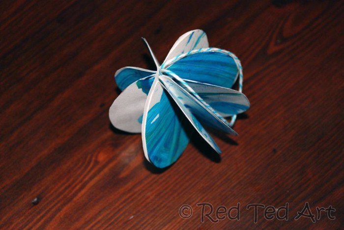 4.- Կլորակի մը ձախ կողմի ծալքին վրայ խէժ դիր եւ անոր վրայ փակցուր ուրիշ շրջանակի մը աջ կողմը: Նոյն ձեւով իրարու փակցուր բոլոր կլորակները: Վերջին երկու բաժինները իրարու փակցելէ եւ գունդը ստանալէ առաջ ծալքին վրայ խէժ դիր եւ երկուքի ծալած թելդ վրան փակցուր: Ապա գունդդ գոցէ վերջին երկու ծալքերը իրարու փակցնելով: