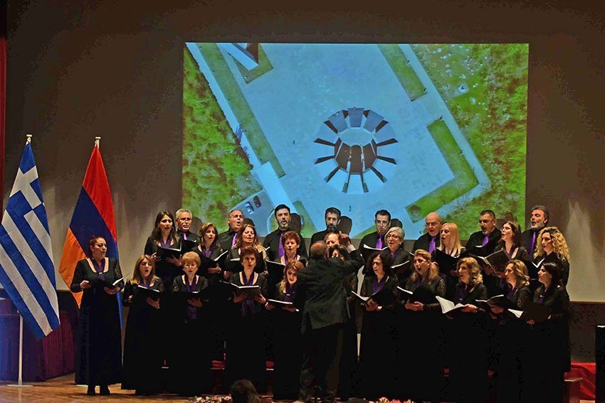 Ռազմական թանգարանի սրահը կանուխէն լեցուցած մեր հայրենակիցներու եւ յոյն եւ օտար դէմքերու ու բարեկամներու շատ մեծ թիւ մը հաւաքուած էր, ոգեկոչելու համար 104րդ տարելիցը թրքական պետութեան կողմէ կազմակերպուած ու գործադրուած Հայոց Ցեղասպանութեան։ Այս տարի, նախատեսում կատարուած էր, սրահէն դուրս հսկայ պաստառ մը (video wall) զետեղելու մասին, ուր ուղղակի կը սփռուէր սրահի բեմին վրայ գործադրուող յայտագիրը եւ հետեւելու առիթը կուտար բոլոր այն հայրենակիցներուն, որոնց համար կարելի չեղաւ տեղ գրաւել սրահէն ներս, ժողովուրդի մեծ թիւի ներկայութեան պատճառով։