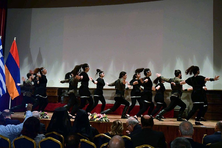Հանդիսասրահի մուտքին պատուոյ ընդունելութեան կարգ կը պահէին Հ.Մ.Ը.Մ.ի սկաուտները, իսկ պաշտօնական հիւրերուն կը դիմաւորէին Հ.Յ.Դ. Յունաստանի Հայ Դատի Յանձնախումբին անդամները։ Խօսքերով հանդէս եկան օրուան նախագահ ընկ. Ալիս Ֆարաճեան, Յունաստանի կառավարութեան կողմէ արտաքին գործոց փոխ նախարար Թերենս Նիքոլաոս Քուիք, հելլէն խորհրդարանի նախագահի ներկայացուցիչ եւ Յունաստան-Հայաստան խորհրդարանական բարեկամութեան խումբի նախագահ Էլէնի Սթամաթաքի, Ատտիկէի փոխ մարզպետ Խրիսթոս Քափաթայիս, Յունաստանի մօտ Հայաստանի Հանրապետութեան դեսպան Ֆադէյ Չարչօղլեան եւ Հ.Յ.Դ. Երիտասարդական Միութեան ներկայացուցիչ ընկ. Արման Գրիգորեան: Օրուան բանախօսն էր յունական մամլոյ հեղինակաւոր ներկայացուցիչներէն «Ռէալ Նիուզ» թերթի հրատարակիչ, ծանօթ լրագրող Նիքոս Խածինիքոլաու, որ խօսեցաւ Թուրքիոյ ժխտողական քաղաքականութեան մասին եւ անոր բանեցուցած ճնշումներուն՝ այն երկիրներուն վրայ, որոնք Ցեղասպանութիւնը ճանչնալու ճանապարհին վրայ են՝ սպառնալիքներով եւ վախի մթնոլորտի տարածումով: Ան մանրամասն անդրադարձաւ Հայոց Ցեղասպանութենէն ետք հայ վրիժառու բազուկներու հասցուցած հարուածներուն եւ հայ ազգի դիմադրական ոգիին, որ կանգուն պահեց հայ ժողովուրդը ահաւոր իր ճակատագրին առջեւ։ Շատ հետաքրքրական եւ բովանդակալից իր ներկայացման մէջ, ծանօթ լրագրողը պախարակեց Թուրքիոյ վարած քաղաքականութիւնը եւ շեշտը դրաւ Ցեղասպանութեան պատմական փաստը ճանչնալու եւ անոր հետեւանքները վերացնելու համայն աշխարհի պարտաւորութեան վրայ: