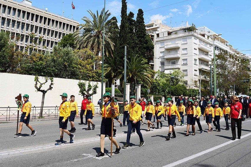 Հանդիսութեան աւարտին, ներկաները՝ պաշտօնական անձնաւորութեանց առաջնորդութեամբ, Հ.Մ.Ը.Մ.ի դմբկահարներու, աստիճանաւորներու, սկաուտական եւ գայլիկական խումբերու, ինչպէս նաեւ Աթէնքի քաղաքապետարանի նուագախումբի ընկերակցութեամբ, սրահէն հաւաքաբար քալեցին դէպի Սինտաղմայի հրապարակի Անծանօթ Զինուորի յուշադամբանը, ուր տեղի ունեցաւ ծաղկեպսակներու զետեղման արարողութիւնը։