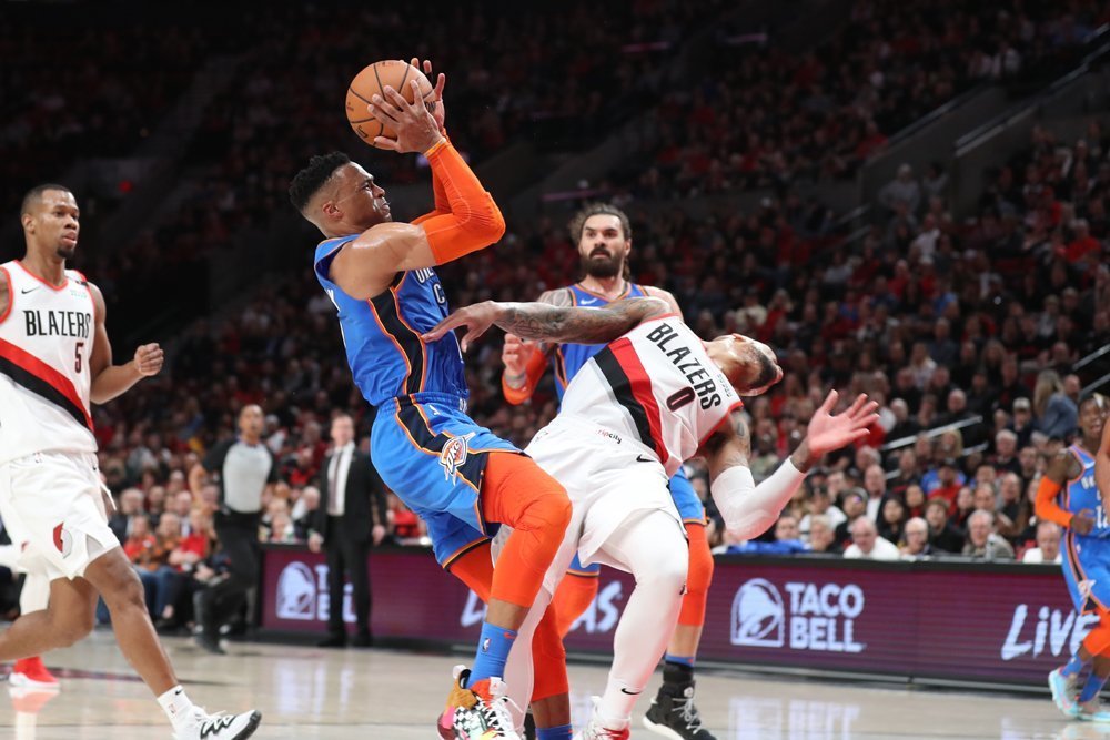 Փորթլենտի մէջ, Օքլահոմա Սիթի 104-99 արդիւնքով պարտութիւն մը կրեց Թրէյլ Պլէյզըրզէն, հակառակ անոր որ Ռասըլ Ուեսթպրուք թրիփըլ-տապըլ մը իրագործեց (24 կէտ, 10 ռիպաունտ, 10 էսիսթ):