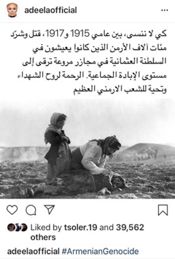 Արաբերէնով. «Այսօր Ապրիլ 24 է: 1915-ին, Օսմանեան կայսրութեան ժամանակաշրջանին, թուրքերուն ձեռամբ գործուած Հայոց ցեղասպանութեան յիշատակի օրը: Ցեղասպանութիւն մը, որուն ընթացքին նահատակուեցան մէկուկէս միլիոն հայեր` ամբողջ ցեղ մը բնաջնջելու իբրեւ փորձ: