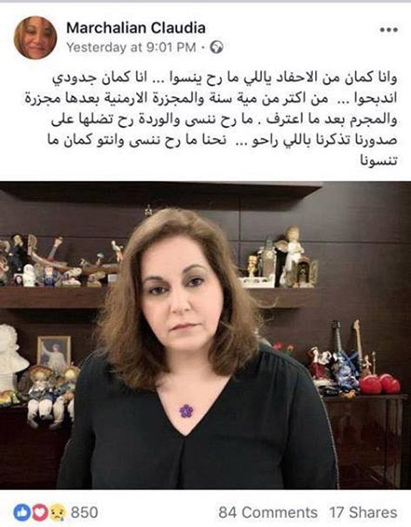 Լիբանանահայ բեմագիր Քլոտիա Մարշալեան ընկերային ցանցերուն վրայ կատարեց հետեւեալ գրառումը. «Ես ալ այն թոռներէն եմ, որոնք պիտի յիշեն… իմ ալ նախահայրերս սպանդի ենթարկուած են…: Հարիւր տարիէ աւելի է, որ Հայոց ցեղասպանութիւնը կը մնայ ցեղասպանութիւն, իսկ ոճրագործը տակաւին չէ ճանչցած: Պիտի յիշենք եւ մեր կուրծքերուն վրայ անմոռուկը վառ պիտի պահենք` յիշելով մեր նահատակները… Մենք պիտի յիշենք, իսկ դուք ալ մեզի մի՛ մոռնաք»: