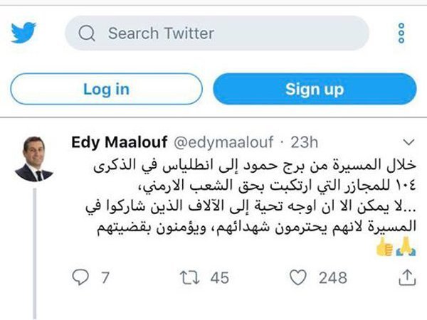 Երեսփոխան Սեզար Մաալուֆ թուիթըրեան գրառումի մը մէջ կ՛ըսէ. «Պատմութեան մէջ մարդկութեան դէմ ամէնէն ահաւոր ոճիրները գործուեցան, երբ հայ եւ ասորի ժողովուրդները ջարդերու ենթարկուեցան: Պատմութիւնը յարատեւ կերպով ամօթի կնիք պիտի դրոշմէ, մինչեւ որ հաւաքական այս ցեղասպանութիւնը ճանաչում ստանայ, եւ իրաւատէրերէն ներում հայցուի»: