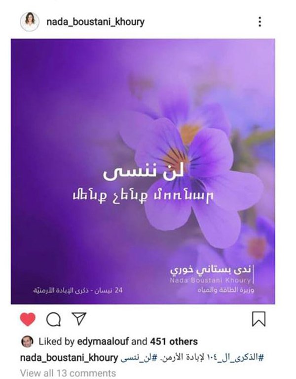 Ուժանիւթի եւ ջուրի հարցերու նախարար Նատա Պուսթանի «Ինսթակրամ»-ի իր էջով տեղադրեց Հայոց ցեղասպանութեան 100-ամեակի խորհրդանիշ անմոռուկը եւ անոր կցեց հայերէնով ու արաբերէնով գրութիւն մը. «Հայոց ցեղասպանութեան 104-ամեակ: Մենք չենք մոռնար»: