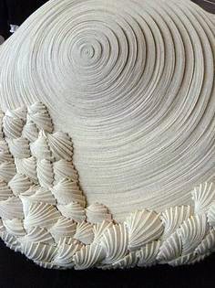 Ան նախ կը կտրէ երիզներ, որոնք վրայ վրայի կը շարէ, կը գլորէ եւ կը ծալէ: Ան այդ կտորները իրարու կը կցէ հազարաւոր գնդասեղներով եւ այս ձեւով կը յառաջացնէ ձեւեր, որոնց մենք կը հանդիպինք բնութեան մէջ` բրածոներ, խեցիներ, ծառի կեղեւ…Բնութիւնը անոր գլխաւոր ներշնչումի աղբիւրն է:
