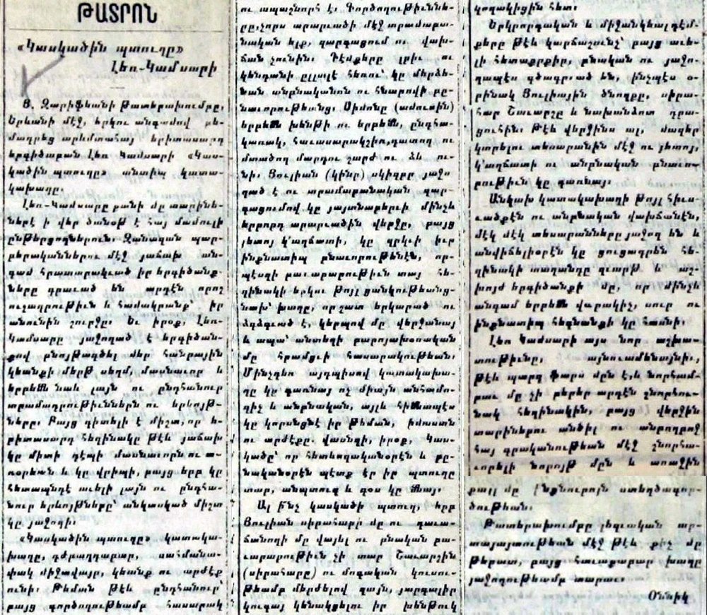 «Լեռ Կամսարը քանի մը տարիներէ ի վեր ծանօթ է հայ մամուլի ընթերցողներուն եւ արդէն արժանացած է ուշադրութեան եւ համակրանքին: Եւ իրօք, ան յաջողած է երգիծանքով բնութագրել մեր հանրային կեանքի մերթ սեղմ, մասնաւոր եւ երբեմն նաեւ լայն` ընդհանուր տրամադրութիւններն ու երեւոյթները: Բայց նկատելի է, որ երբ կը հետապնդէ աւելի ընդհանուր երեւոյթները, անկասկած միշտ կը յաջողի: