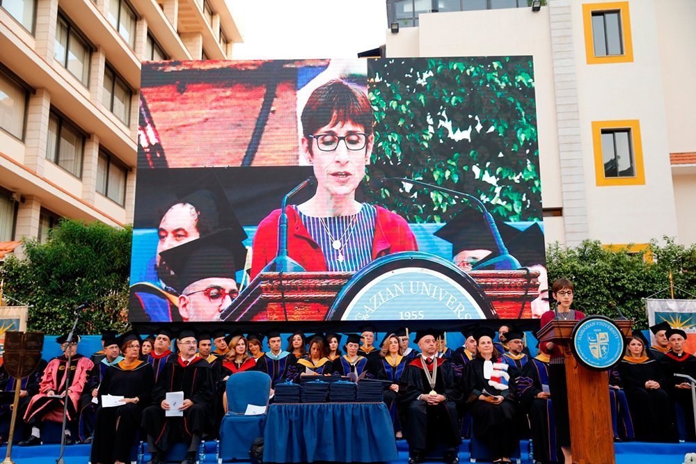 Վեր. դոկտ. Փոլ Հայտոսթեանի խօսքէն ետք բեմ բարձրացաւ Լիբանանի մէջ ՄԱԿ-ի գաղթականներու հարցերով ներկայացուցիչ Միրէյ Ժերարը, որ նախ եւ առաջ շրջանաւարտներուն ներկայացուց ՄԱԿ-ի մէջ իր ունեցած երկարամեայ փորձառութիւնը: Ան կոչ ուղղեց շրջանաւարտներուն իրենց ապագային մէջ կատարելու այնպիսի ընտրութիւններ, որոնք պիտի նպաստեն համամարդկային արժէքներու, մարդու բարօրութեան եւ լաւ ապագայի. կատարելու այնպիսի ընտրութիւններ, որոնք ապագային նաեւ իրենց ազդեցութիւնը պիտի ունենան ո՛չ միայն ընտրութիւն կատարող անհատին վրայ, այլեւ դրականօրէն իր ազդեցութիւնը պիտի ձգէ շրջապատին եւ աւելի լայն շերտերու վրայ: