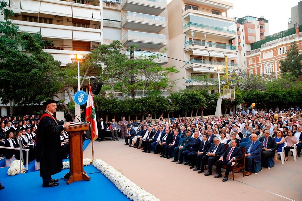 Ներկաներու ծափահարութիւններուն ներքեւ շրջանաւարտները դասախօսական կազմին հետ ուղղուեցան բեմ, ապա հնչեց Լիբանանի քայլերգը, որուն յաջորդեց համալսարանի հոգեւոր հովիւ վեր. Ուիլպըրթ Վան Սանի աղօթքով պաշտօնական բացումը: