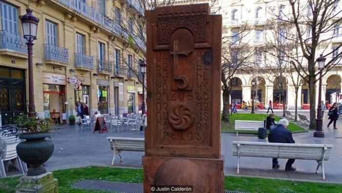 Սան Սեպասթիան քաղաքի Ս. Հովիւ տաճարի մուտքէն քանի մը քայլ անդին կանգնած է երկու երեսով հողեղէն սալաքար մը: Պասքերու երկրի այս անկիւնին մէջ ատոր ներկայութիւնը տարօրինակ կը թուի: Մէկ կողմին վրայ փորագրուած է առաքելական խաչ մը, իսկ միւս կողմին վրայ` խորհրդաւոր թուացող ոչ լատիներէն տառեր: Ատոնք հաստատ Euskara չեն, ծանօթ` իբրեւ պասք, եւրոպական առեղծուածային լեզու մը, որ ապրող ոչ մէկ լեզուի հետ յստակ կապեր ունի: