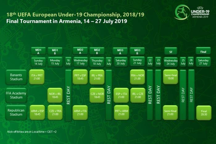 Երեւանի մէջ տեղի ունենալիք Եւրոպայի ֆութպոլի 19 տարեկանէն վար ախոյեանութիւնը կը սկսի 14 յուլիսին` Հայաստան – Սպանիա բացման մրցումով, յայտնեց Հայաստանի ֆութպոլի ֆետերասիոնին պաշտօնական կայքը: