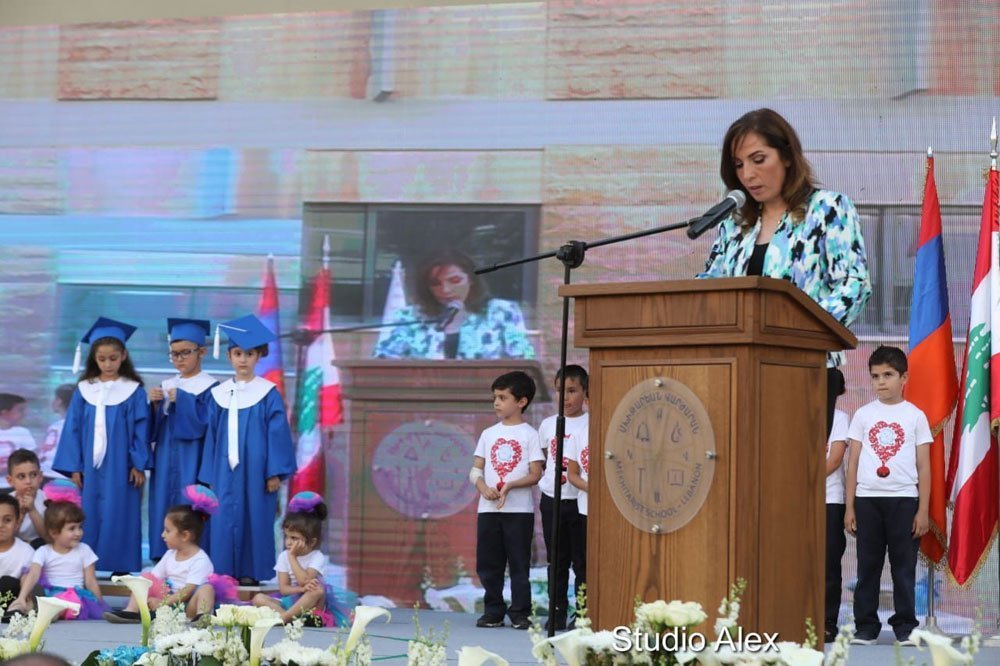 Ապա հոգեւոր հoր, տնօրէնին եւ մանկապարտիզպանին` Սիպիլա Մալեանի ձեռամբ տեղի ունեցաւ վկայականներու բաշխումը, որուն աւարտին Ա. կարգի աշակերտները ֆրանսերէնով արտասանուած բարի գալուստի խօսքերով դիմաւորեցին նախակրթարան հասնող ծաղիկները: