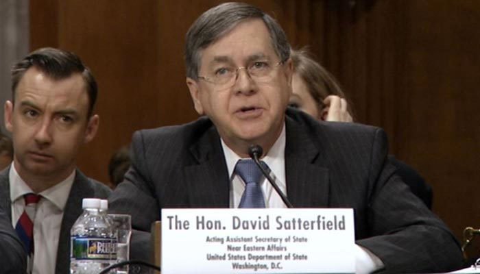 Ներկայիս Միացեալ Նահանգներու արտաքին գործոց նախարարի Միջին Արեւելքի հարցերով օգնական Սաթըրֆիլտ կը սպասէր Ծերակոյտի հաստատման, որովհետեւ Միացեալ Նահանգներու նախագահ Տանըլտ Թրամփ անոր թեկնածութիւնը առաջադրած էր 16 փետրուարէն ի վեր: