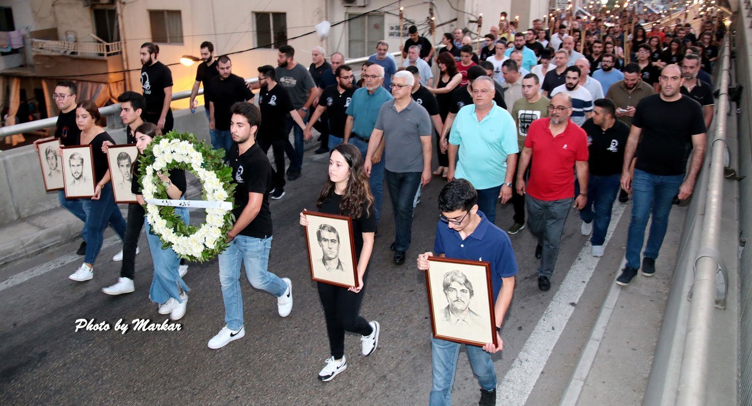 ՀՅԴ ԼԵՄ-ի Կեդրոնական վարչութեան Քարոզչական յանձնախումբին կազմակերպութեամբ Լիզպոնի տղոց նուիրուած յիշատակի երեկոն սկսաւ երեկոյեան ժամը 7:30-ին, երբ հարիւրաւոր պատանիներ եւ երիտասարդներ, հայորդիներ, ՀՄԸՄ-ի շեփորախումբին առաջնորդութեամբ, ԼՕԽ-ի «Արաքսի Պուլղուրճեան» ընկերաբժշկական կեդրոնին առջեւէն ջահերթով ուղղուեցան դէպի Պուրճ Համուտի Ազգային գերեզմանատուն, ուր անոնց միացան նոյն նպատակին համար հոն գտնուող մեծաթիւ հայորդիները եւ միասնաբար ծաղիկներ զետեղեցին, մոմեր վառեցին անոնց շիրիմին վրայ:
