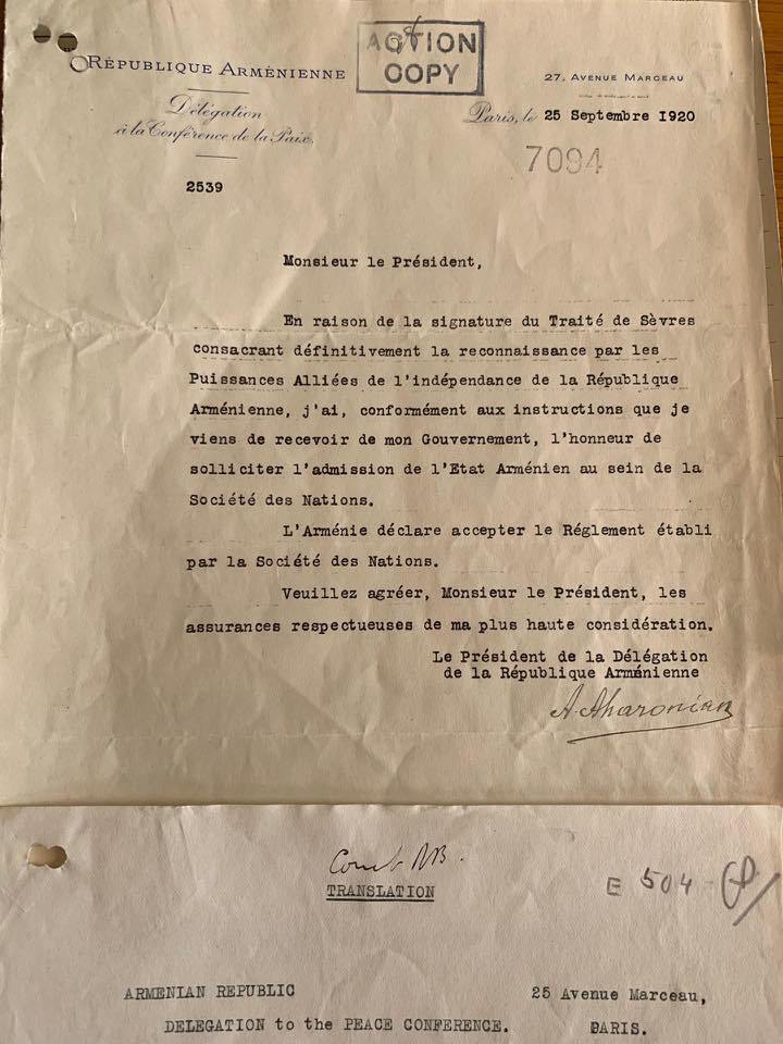 Նկատի առնելով, որ Սեւրի պայմանագրի ստորագրմամբ Դաշնակից տէրութիւնները վերջնականապէս ճանաչել են Հայաստանի Հանրապետութեան անկախութիւնը, իմ կառավարութեան կողմից ինձ տրուած հրահանգների համաձայն, պատիւ ունեմ խնդրելու, որ Հայաստանի պետութիւնն ընդգրկուի Ազգերի լիկա: