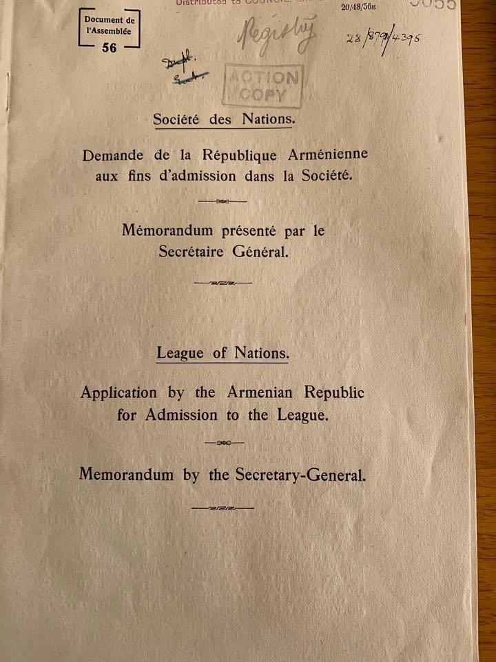Զուիցերիայում Հայաստանի արտակարգ եւ լիազօր դեսպան, ՄԱԿ-ի Ժընեւեան գրասենեակում ՀՀ մշտական ներկայացուցիչ Անդրանիկ Յովհաննիսեանն այցելել է Ազգերի լիկայի գրադարան եւ հրապարակել Փարիզի Հաշտութեան խորհրդաժողովում Հայաստանի Հանրապետութեան ղեկավար Աւետիս Ահարոնեանի դիմումը ներկայացնող փաստաթուղթը` Հայաստանի Ա. Հանրապետութեան` Ազգերի լիկային անդամակցելու վերաբերեալ: