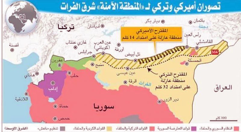Դիւանագիտական արեւմտեան աղբիւրներ «Շարք Աուսաթ» օրաթերթին յայտնեցին, որ Սուրիոյ մէջ Եփրատի արեւելեան ափին վրայ «անվտանգութեան գօտի»-ի շուրջ գոյացած թուրք-ամերիկեան փոխադարձ հասկացողութեան հիմամբ այդ շրջանը պիտի ըլլայ Ռասուլ Այն եւ Թել Ապիատ քաղաքներուն միջեւ 70-80 քիլոմեթր երկարութեամբ եւ 5-14 քիլոմեթր խորութեամբ, այդտեղ թրքական եւ ամերիկեան ուժերը միասնաբար պարեկային ծառայութիւն պիտի կատարեն, ինչպէս նաեւ գործողութիւններու միացեալ կեդրոն պիտի հաստատուի: