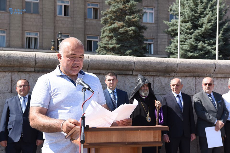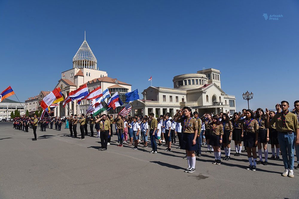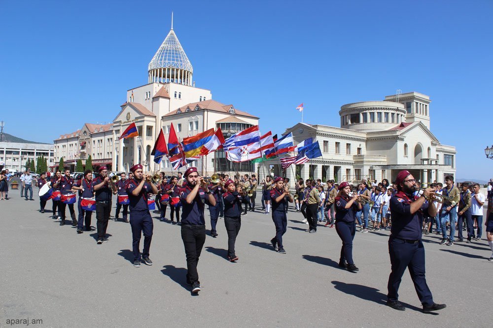Պաշտօնական արարողութիւնը տեղի ունեցաւ Ստեփանակերտի «Վերածնունդ» հրապարակին վրայ: Նախ, սկաուտական շեփորախումբին առաջնորդութեամբ հրապարակ մուտք գործեցին դրօշները Արցախի, Հայաստանի եւ 25 երկիրներու, ուր ՀՄԸՄ-ը կը գործէ իր 110 մասնաճիւղերով: Հնչեց Արցախի քայլերգը, որմէ ետք շեփորախումբը նուագեց ՀՄԸՄ-ի «Յառաջ նահատակ» քայլերգը:
