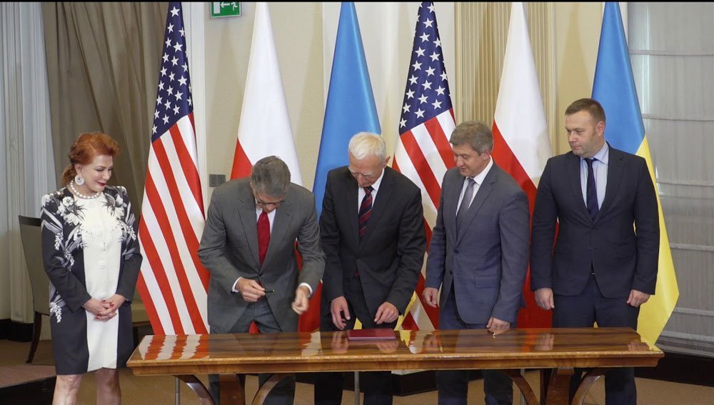 Համաձայնագիրը ստորագրած են Ուքրանիոյ անվտանգութեան խորհուրդի քարտուղար Ալեքսանտր Տանիլիուք, Լեհաստանի կառավարութեան ուժանիւթային հարցերով լիազօր ներկայացուցիչ Փիոթր Նայիմսքի եւ Միացեալ Նահանգներու ուժանիւթի նախարար Ռիք Փերի:
