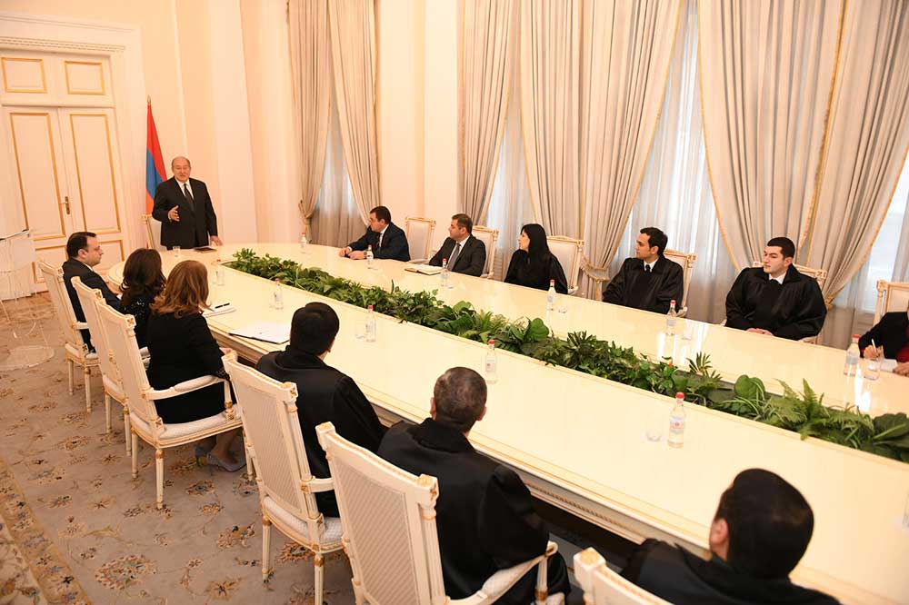 Նախագահ Արմէն Սարգսեան շնորհաւորեց նոր նշանակուած դատաւորներն ու յաջողութիւն մաղթեց պատասխանատու աշխատանքին մէջ: «Կ՛ուզեմ յիշեցնել, որ ձեր աշխատանքէն շատ բան կախեալ է մեր երկրի թէ՛ կայունութեան, թէ՛ պետականութեան կառուցման իմաստով: Չկայ պետութիւն, ուր որոշակի հաստատութիւններ կայուն չեն, ուր որոշակի հաստատութիւններու նկատմամբ խոր յարգանք չկայ, եւ այդ երկիրը կայուն է ու զարգացման կարելիութիւն ունի», նշեց նախագահը` զարգացման կարեւոր կառոյցներէն մէկը նկատելով ինքնին դատական համակարգը: Նախագահը ընդգծեց օրէնքի եւ օրինականութեան պահպանման դերն ու կարեւորութիւնը` երկրին մէջ արդարութեան ու արդարադատութեան եւ դատարաններու նկատմամբ վստահութեան տեսանկիւնէ: