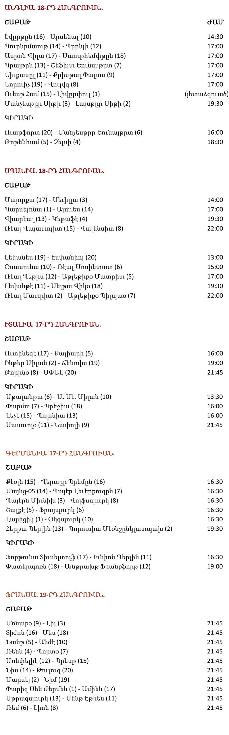 Ստորեւ կու տանք շաբաթավերջին տեղի ունենալիք մրցումներուն յայտագիրը (ժամերը` Պէյրութի ժամանակացոյցով. փակագիծերուն մէջ նշուած են խումբերուն գրաւած դիրքերը).