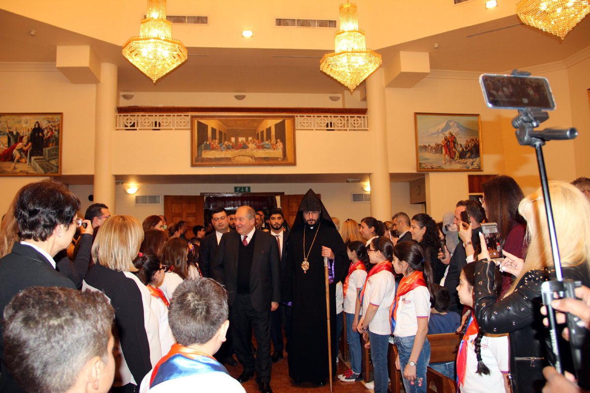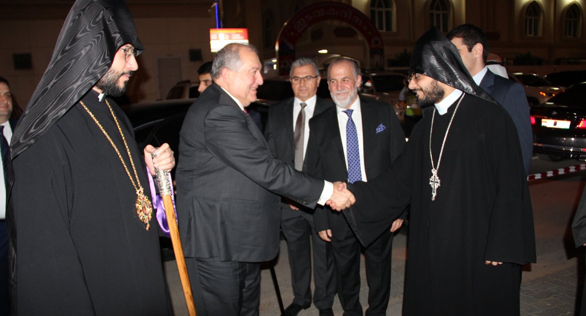Սրբազան հայրը յանուն Մեծի Տանն Կիլիկիոյ Արամ Ա. կաթողիկոսին, Արաբական Միացեալ Էմիրութեանց եւ Քաթարի հայոց թեմի Ազգային իշխանութեան եւ հաւատաւոր ժողովուրդին ողջունեց հանրապետութեան նախագահին այցելութիւնը համալիր: Սրբազան հայրը իր խօսքին մէջ անդրադարձաւ անցնող տարիներուն ընթացքին նախագահին ունեցած դերակատարութեան ու նպաստին, յատկապէս արտաքին յարաբերութիւններու միջոցով, որոնք մեծապէս օգտակար դարձան Հայաստանի Հանրապետութեան: Սրբազան հայրը իր խօսքին մէջ նաեւ մատնանշեց թեմի ժողովուրդին ունեցած իւրայատուկ կապուածութիւնը հայրենիքին նկատմամբ: Խօսքին աւարտին սրբազան հայրը շեշտեց անցնող տասնամեակներուն ընթացքին սփիւռքահայութեան ունեցած մեծ դերակատարութիւնը հայրենիքին նկատմամբ` նիւթական եւ բարոյական ներդրումներով, որոնք մինչեւ օրս կը շարունակուին: Սրբազան հայրը նախագահի յատուկ ուշադրութեան յանձնեց իրավիճակը միջինարեւելեան կարգ մը գաղութներու, որոնք կը գտնուին պատերազմի եւ կամ քաղաքական անկայուն վիճակի մէջ` շեշտելով, որ Հայաստանը նմանօրինակ երեւոյթներու նկատմամբ առաջնահերթ կերպով պէտք է օգտակար դառնայ հայ գաղութներուն: Խօսքը եզրափակելով` սրբազան հայրը ըսաւ. «Հայրենիքը մեծագոյն սրբութիւն է, որուն անվտանգութիւնը համայն հայութեան պարտականութիւնն է, հետեւաբար բոլորս ալ կոչուած ենք պայքարելու հայրենիքի ապահովութեան եւ բարգաւաճման համար»: