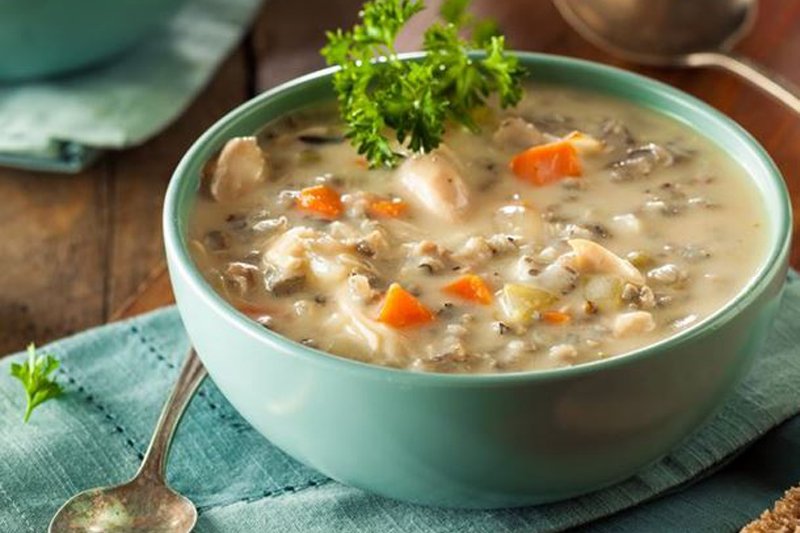 Աւելցնել մսաջուրը եւ ձգել որ 20 վայրկեան եռայ թեթեւ կրակի վրայ: Ապա խառնուրդը հարիչէ անցընել եւ կրկին կաթսային մէջ փոխադրել` աւելցնելով աղը, սեւ պղպեղը, լուացուած բրինձը, կտրտուած հաւու միսը եւ շարունակել եփել շուրջ 40 վայրկեան: