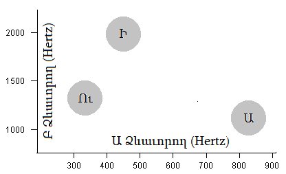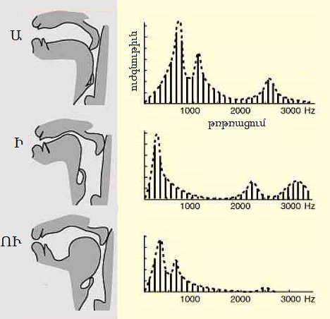 պատրաստել միայն երկու տարածաչափային, այսինքն տափակ էջի մը վրայ: Մօտ ութսուն արհեստավարժ երգիչներու օգնութեամբ չափումներ կատարուած են (3): «Ձեւաւորող» թրթռացումները կը համապատասխանեն «վրան»-ներու գագաթներուն, իսկ գծիկները` ձայնային լարերու արտադրած թրթռացումներուն: Կը տեսնենք որ ձայնային խոռոչի ձեւը հիմնովին կը փոխէ գծապատկերը (ձայնաւորը): Այս մասին կան ընդարձակ ուսումնասիրութիւններ եւ նոյնիսկ դոկտորական աւարտաճառեր (3, 4): Ի դէպ իմ աւարտաճառս կը վերաբերէր ձայնի տարածման ծակոտկեն միջոցի մը մէջ գտնուող գերհեղուկ ջրածինի (Superfluid He4) որ արտազգայնական (extrasensory) յատկութիւններ ունի:- Ingo R. Titze et al «A Formant Range Profile for Singers», J. Voice 5 May 2017 N. Henrich, J. Smith, and J. Wolfe, «Vocal tract resonances in singing: Strategies used by sopranos, altos, tenors, and baritones», Journal of the Acoustical Society of America, 2011, 129(2)