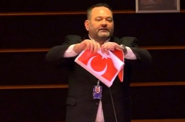 Պրիւքսելի մէջ կայացած Եւրոպական խորհրդարանի նիստի ընթացքին յոյն երեսփոխան Իոնիս Լակոս իբրեւ բողոքի նշան պատռած է Թուրքիոյ թուղթէ դրօշը: Այս մասին կը հաղորդէ թրքական «Հապերլեր» կայքը:
