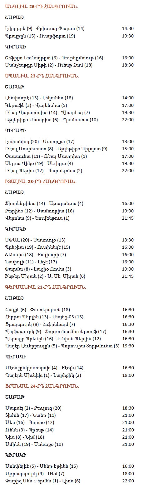 Ստորեւ` շաբաթավերջի մրցումներուն յայտագիրը (ժամերը` Պէյրութի ժամանակացոյցով. փակագիծերուն մէջ նշուած են խումբերուն գրաւած դիրքերը).