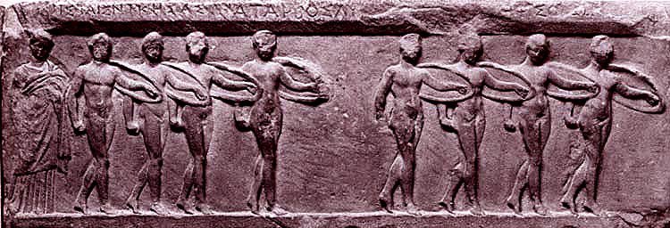 Իրենց ոսկեդարի ընթացքին (5-3 դարեր ն.ք.) Յոյներ խօսած են նաեւ պարի մասին: Մեզի հասած գլխաւոր աղբիւրն է Արիստոտելի աշակերտներէն Aristoxenus-ի (375-335 ն.ք) հեղինակած «Ներդաշնակութեան Տարրերը» (Արմոնիքա Սթոիխէա) երկի երեք գլուխներ: Արիսթոխենոս նկարագրած է «pyrrhic» (հրաշէկ) ռազմական պարի յարձակողական եւ պաշտպանողական շարժումները: Կողքի բարձրաքանդակը (Դ դար ն.ք.) կը պատկերէ այդ պարը: Հորիզոնական շարժումներ (խորէա) կ’արտայայտէին պարընկերներու հետ գործակցութիւն, իսկ ուղղահայեաց ոստումնային շարժումներ՝ (Օրխեսիս) եռանդ (5): Արիսթոխենոս կը խօսի յատկապէս կշռոյթի մասին: Աշխատանքը լատիներէնի թարգմանուած է աւելի քան 19 դար ետք (1564), այդ նոյնպէս ցոյց կու տայ պարի անտեսումը ակադեմականներու կողմէ: