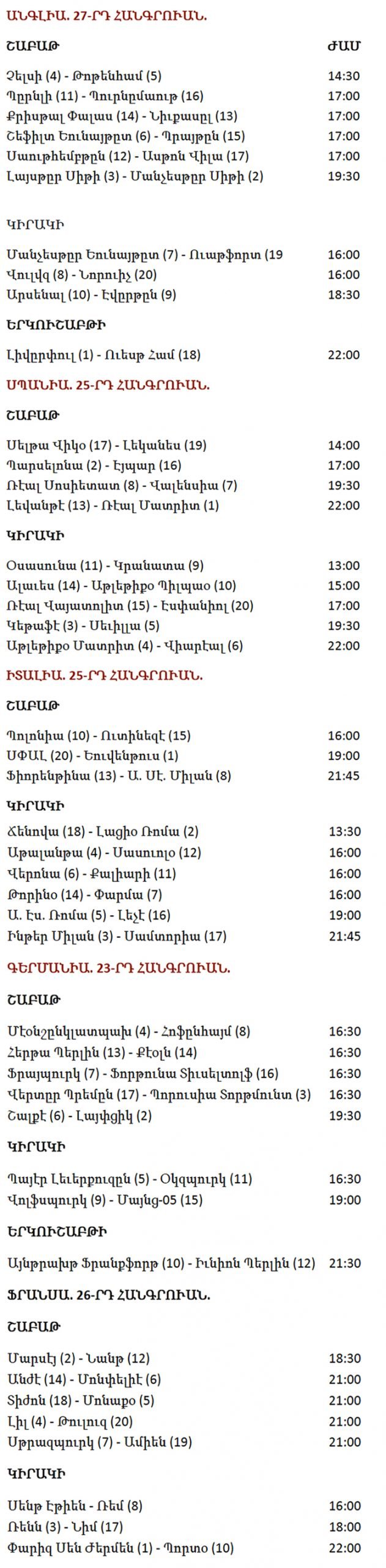 Ստորեւ` մրցումներուն յայտագիրը (ժամերը` Պէյրութի ժամանակացոյցով. փակագիծերուն մէջ նշուած են խումբերուն գրաւած դիրքերը).