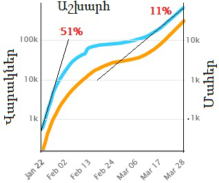 Համաշխարհային Պատկեր.- Ընթերցողներէն ոմանք թերեւս կը հետեւին միջազգային կայքերու, ինչպէս «Worldmeter», ուր կը տեսնեն նման գծագիրներ: Կապոյտ (բարձր) գիծը կը ներկայացնէ վարակներու թիւը, իսկ ծիրանագոյն (ցած) գիծը` մահերու: Նկատել, որ աջ առանցքի (axis) միաւորները տասն անգամ փոքր են` բաղդատած ձախին (1): Վարակի աճը ներկայիս օրական շուրջ 11 տոկոս է (2): Մահերը գրեթէ զուգահեռ են: Միջին հաշուով մահացած է վարակուողներուն 4,7 տոկոսը: Այստեղ կան երկու նկատողութիւններ: Նախ այն, որ կը մահանան անոնք, որոնք քանի մը օրեր առաջ վարակուած են: Այդ միջոցին վարակի թիւը ի հարկէ կ՛աճի եւ, հետեւաբար, մահացողներուն տոկոսը արհեստականօրէն կը նուազի: Իսկական տոկոսը ուրեմն աւելի բարձր է: Ապա այն, որ վարակուողներուն ստացած խնամքը, ուրեմն նաեւ մահացութիւնը, մեծապէս կը տարբերին երկրէ երկիր: