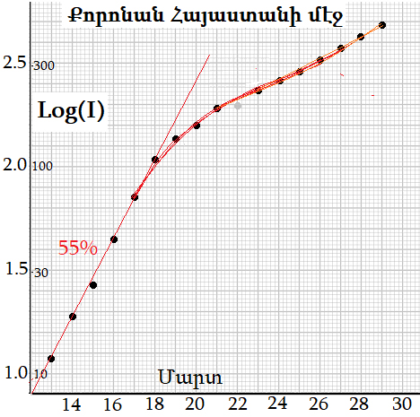 Հայաստանի մէջ անցեալ շուրջ տասը օրերուն աճը եղած է մօտ 15 տոկոս: Ատիկա բարձր է համաշխարհային միջինէն: Եթէ վարակը (գծագիրին մէջ I) նոյն թափով ընթանայ, ապա նուազ քան շաբաթ մը ետք թիւը աւելի քան պիտի կրկնապատկուի (4): Աւելի եւս մտահոգիչ նկատողութիւնը այն է, որ գծագիրի կորութիւնը դէպի վեր է (5): Այդ կը նշանակէ որ աճը տակաւ թափ կ՛առնէ: Մեկնաբանութիւնը կը թողում ընթերցողին: