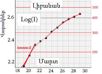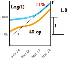 - Օրէ-օր համեմատական աճը կարելի է հաշուել` հիմնուելով գծագիրի հակումին (slope): Թուաբանութեան լեզուով` ածանցին (derivative): Կողքի գծագիրին մէջ ΔLog(I)/Δt = 1.8/40 = 0.045, բայց ΔLog(I) կը նշանակէ Log(If /Ii), այսինքն աւարտական եւ սկզբնական աճերու համեմատութեան տիպահամարը (logarithm): Քանի որ բաժնած ենք օրերու թիւով, օրական աճի համեմատութիւնն է 10^0.045 = 1 + 0.109, այսինքն մօտ 11 տոկոս:
