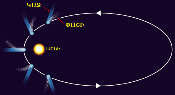 Մոլորակներու պտոյտի հարթակը կողքի պատկերի մէջ տեսնուող փոքր կորիզն է: Արտաքին գնդաձեւ նոսր Օըրթ (Oort) ամպը կազմուած է թեթեւ նիւթերէ: Այս շատ հասկնալի է որովհետեւ ծանր նիւթեր, ինչպէս մետաղներ, վաղուց «ինկած են» դէպի Արեւ: Արեւուն մօտիկ «երկրային» մոլորակներ Փայլածու, Արուսեակ, Երկիր եւ Հրատ (Mercury, Venus, Earth, Mars) կազմուած են ծանր նիւթերէ, իսկ հեռու, հսկայ մոլորակները՝ Լուսնթագ, Երեւակ, Ուրան եւ Նեպտիւն (Jupiter, Saturn, Uranus Neptune)՝ թեթեւ մասնիկներէ: Վերջին երկուքը հայկական անուններ չունին, որովհետեւ պարզ աչքով տեսանելի չէին մեր նախահայրերուն: