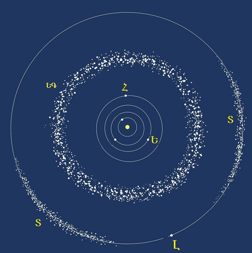 Ա.- Քէոյփըր (Kuiper, վերեւի պատկերին մէջ նշուած «Ք» տառով) գօտին ունի գիրուկ մատանիի կամ կարկանդակի ձեւ (toroid): Կը գտնուի ութ մոլորակներու ուղեծիրերու հարթակին մէջ, բայց աւելի մեծ հեռաւորութեան վրայ: Հակառակ իր հսկայական ծաւալին, գօտիի զանգուածը փոքր է, լուսնի զանգուածէն իսկ փոքր, երկրագունդի լոկ մէկ տոկոսը: Գաճաճ Պղուտոն, որ մինչեւ 2006 մոլորակ կը համարուէր, այժմ կցուած է Քէոյփըր գօտիի այլ գաճաճ «մոլորակ»-ներու շարքին: