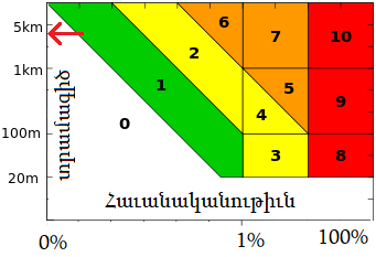 Երկնաքարերը կը դասաւորուին նաեւ ըստ իրենց ներկայացուցած վտանգի աստիճանին: Այս դասաւորումը, սակայն, պարտադրաբար պայմանական է, որովհետեւ անիմաստ է բախումի պատճառած աւերը ճշգրտօրէն գնահատել: Այս ուղութեամբ 1999-ին Թորոնթոյի մէջ գումարուած աստղագիտական համագումարը որոշած է վտանգի չափանիշ մը, որ կը տարուբերի զերոյէն տասնի միջեւ: Այդ նիշը կը համեմատի երկնաքարի տրամագիծին, բազմապատկած բախման հաւանականութեան (14): Երկնաքար 52678-ի տրամագիծը ցոյց տրուած է նետիկով մը: Հաւանականութիւնը կարելի է հաշուարկել, երբ յստականայ, թէ որքա՞ն է երկնաքարի ծիրի անորոշութիւնը: Այսինքն ի՞նչ է անոր «լայնքը»: Ձգողութեան