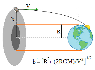 պատճառով երկրին կրնան բախիլ մարմիններ, որոնք այլապէս աւելի հեռուէն պիտի անցնէին: Երկրի առերեւոյթ շառաւիղը (b) կը թուի աւելի խոշոր (b > R): Բարեբախտաբար աւելի արագ անցնող մարմիններ նուազ ժամանակ կ’ունենան «զգալու» երկրի ձգողութիւնը եւ հետեւաբար նուազ կը շեղին իրենց ծիրէն: Այդ ի հարկէ կը նուազեցնէ բախումի հաւանականութիւնը: Բարեբախտաբար նաեւ աւելի դիւրին է հետեւիլ վտանգաւոր երկնաքարերու, որովհետեւ աւելի խոշոր են: Այդ կրնայ բաւարար ժամանակ տալ, որպէսզի կարելի միջոցառումներ ձեռք առնուին: Ցած արտակեդրոնութիւն ունեցող երկնաքարերու ծիրը աւելի լաւ տեսանելի է, որովհետեւ կ’ունենան աւելի հորիզոնական տեղափոխում: Ինչպէս կողքի գծանկարը ցոյց կու տայ, խոշոր երկնաքարերու մեծամանութիւնը տասնամեակ մը առաջ արդէն իսկ յայտնագործուած էր: