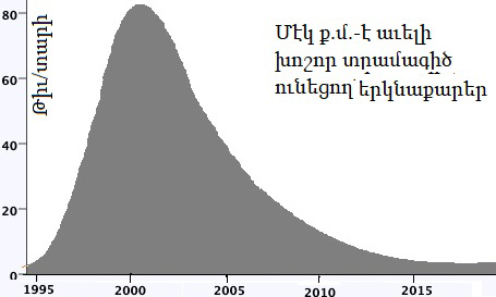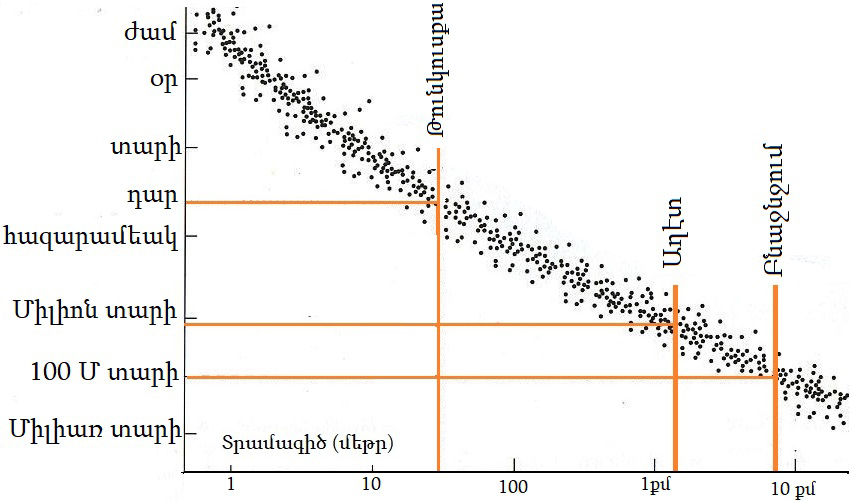 Վիճակագրական .- Արեգակնային դրութիւնը լեցուն է փոշիով եւ այլազան չափի քարերով: Անոնք անդադար կը ռմբակոծեն Երկրագունդի մթնոլորտը: Վիճակագրութեան վրայ հիմնուած գծանկարը ցոյց կու տայ հաւանականութիւնը, ըստ քարի տրամագիծին: Մէկէն երկու մեթր տրամագիծով քար կարելի է ակնկալել իւրաքանչիւր օր: Այդ կը փշրուի մթնոլորտին մէջ: Սիպերիոյ մակարդակի երկնաքար՝ թերեւս իւրաքանչիւր դար: Այդ համատարած աղէտ չի նշանակեր: Նոյնիսկ տեսականօրէն Հիրոշիմայի տարողութեամբ երկնաքարեր կրնան անցնիլ աննկատ: Երկնաքար 52678-ի տարողութեամբ աղէտ հաւանաբար պատահի հազիւ մի քանի միլիոն տարին անգամ մը: Այսինքն հաւանաբար եւ բարեբախտաբար չէ պատահած մեր ցեղի (homo sapiens իմացական մարդ) գոյութեան ընթացքին, որն է շուրջ 250 հազար տարի: Բնաջնջում կարելի է ակնկալել մի քանի միլիոն տարի ետք: Բայց մինչ այդ մենք արդէն իսկ Երկրագունդը անբնակելի դարձուցած կ’ըլլանք …