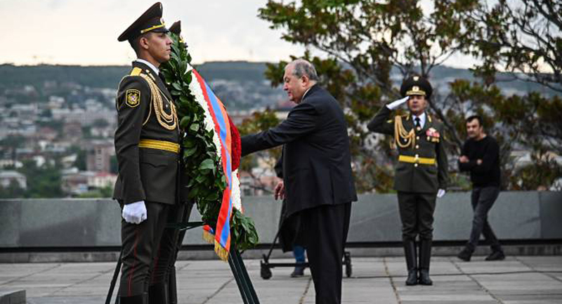Ներկաները ծաղիկներ խոնարհեցին «Մայր Հայաստան» յուշահամալիրի անմար կրակին մօտ` յարգանքի տուրք մատուցելով զոհուածներու յիշատակին: Յաղթանակի զբօսայգիին մէջ էին նաեւ օրուան հերոսները` վեթերանները, որոնք մեծարուեցան, երախտագիտութեան ու շնորհակալական խօսքեր լսեցին իրենց կատարած սխրանքներուն համար: