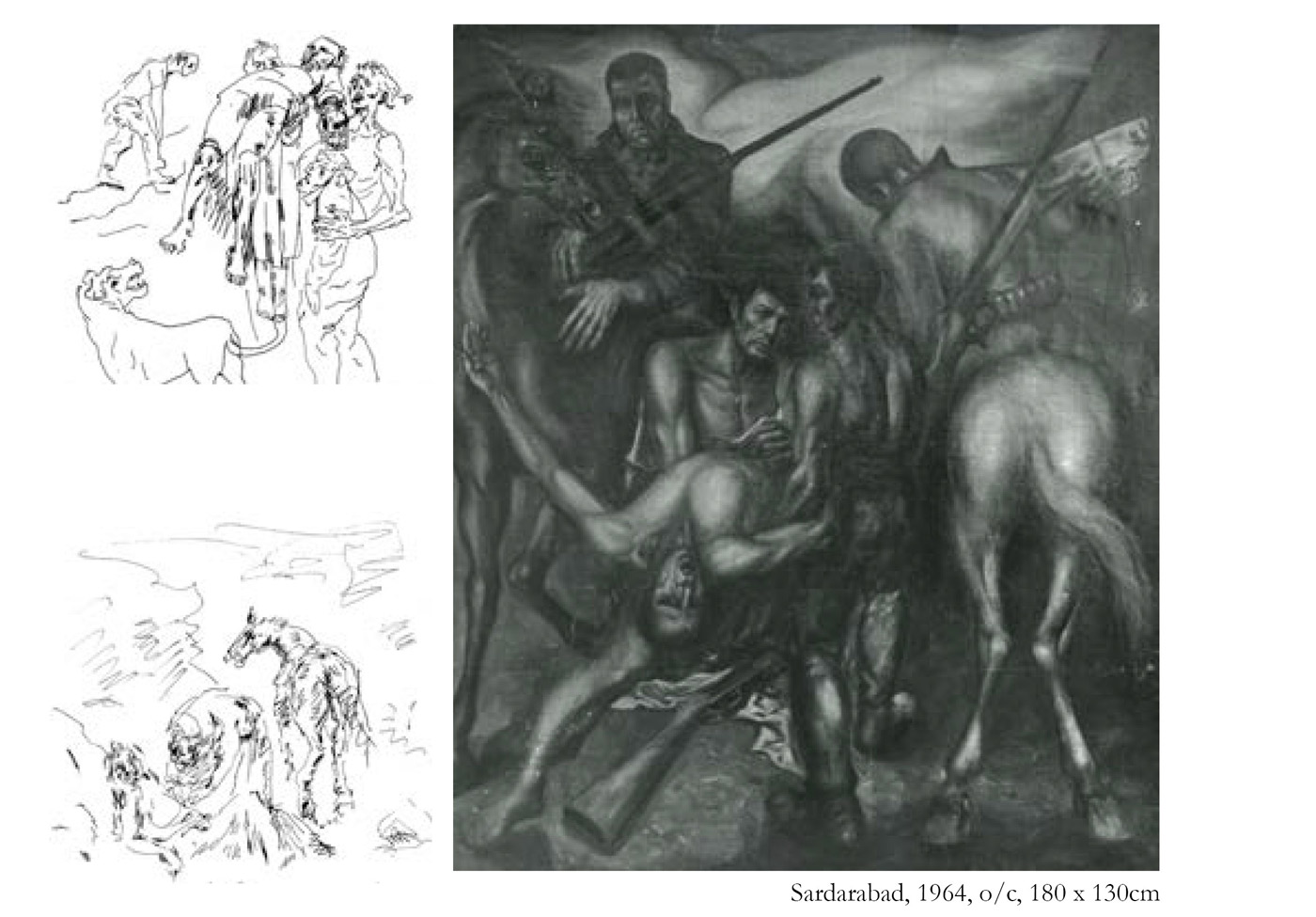 Իբրեւ վկայականի աշխատանք` ես նկարել էի մի դրուագ Սարդարապատի ճակատամարտից եւ անունը դրել` «Սարդարապատ»: «Կամբոզիցա»-ի երկու կողմերում նկարել էի զինուորներ, մէկը, որ երիտասարդ տարիքին պապուս է յիշեցնում գնում է դէպի պատերազմի դաշտ` կռուելու, իսկ միւսը յոգնած վերադառնում է կռուից: Նրանց արանքում` երկու ազատամարտիկներ տանում են մի վիրաւորի: Դասատուներս հայրենասէր եւ տաղանդաւոր նկարիչներ էին` Զուլում Գրիգորեան, Ռուտոլֆ Կարզալոյեան եւ վաղամեռիկ Վանիկ Համբարձումեան: Աշխատանքս շատ հաւանեցին, սակայն առաջարկեցին, որ անունը փոխեմ: Սկզբում ընդդիմացայ եւ յետոյ հասկացայ, որ չէր անցնելու, եւ ես զրկւում էի վկայականից: Առաջարկում էին համայնավարական ճակատամարտի անուն: Վաղամեռիկ Վանիկ Համբարձումեանը միջին ճանապարհ գտաւ եւ առաջարկեց, որ անունը դնենք «Յեղափոխականներ». ով ինչ ուզում է, թող հասկանայ: Համաձայնուեցի, եւ անցաւ:
