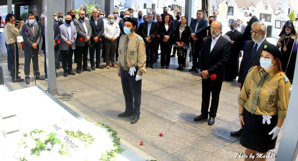 Առաջին առիթով ծաղկեպսակ զետեղուեցաւ Ֆըրն Շըպէքի Ազգային գերեզմանատան մէջ, ուր հանգչած են նուիրեալներէն մաս մը: Ապա Պուրճ Համուտի գերեզմանատան մէջ` ՀՅԴ պանթէոնին դիմաց , տեղի ունեցաւ յատուկ հանդիսութիւն մը, որուն ներկայ գտնուեցան Լիբանանի թեմի կաթողիկոսական փոխանորդ Շահէ եպս. Փանոսեան եւ Լիբանանի թեմի կղերական դասէն ներկայացուցիչներ, Լիբանանի մէջ Հայաստանի դեսպան Վահագն Աթաբեկեան եւ դեսպանատան անձնակազմը, ՀՅԴ Բիւրոյի ներկայ եւ նախկին անդամները, ՀՅԴ Լիբանանի Կեդրոնական կոմիտէի կազմը, կոմիտէներու հերթապահները, ԼԵՄ-ի Կեդրոնական վարչութեան, Պատանեկան ԸՎՄ-ի եւ ԶՈՄ-ի ներկայացուցիչներ, Լիբանանի թեմի ազգային իշխանութեանց ներկայացուցիչներ, ուղեկից միութիւններու ` Համազգայինի, ՀՄԸՄ-ի եւ ԼՕԽ-ի ներկայացուցիչներ, կուսակցական նախկին երեսփոխաններ, Պուրճ Համուտի քաղաքապետը, «Ազդակ» օրաթերթի եւ «Վանայ ձայն»-ի տնօրէնները: