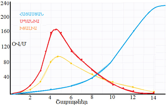 Ուսումնասիրութիւնները եւրոպական երկիրներուն կը թելադրէին վարակի օրական աճը պահել 5 տոկոսէն վար, որպէսզի կարելի ըլլայ խնամել ծանր պարագաները (6): Հայաստանի կարողութիւնները անհամեմատ նուազ են, ուրեմն սկզբնական աճը պէտք էր պահել 5 տոկոսէն շատ աւելի վար: Բայց անցեալ շաբաթներուն աճը յաճախ կը մօտենար 10 տոկոսի, մինչ պատասխանատուները հայաստանավարի մեծամիտ արտայայտութիւններ կ՛ունենային: Դժուար է հաւատալ, թէ «Հիւանդութիւնների վերահսկման եւ կանխարգելման ազգային կենտրոնը» նուազ իրազեկ է, քան նուաստս: Գծագիրը ցոյց կու տայ իւրաքանչիւր միլիոն բնակիչի վարակներու օրէ-օր թիւը: Կը տեսնենք, որ Հայաստան գլած է աղէտահար Սպանիան (7): Երէկ արձանագրուեցան 612 վարակներ (8): Եթէ նոյնիսկ 2.5 միլիոն համարենք բնակութեան թիւը, ապա իւրաքանչիւր միլիոնի կը հասնի 245 վարակ: Այդ շուրջ 150 տոկոս աւելի վատ է, քան Սպանիոյ աղէտի բարձրակէտը: Եթէ զանց առնենք միայն օրինական իմաստով պետութիւն սեպուող վայրեր, ինչպէս Վատիկան կամ Անտորա, ապա մեր հայրենիքը կը գրաւէ ներքեւի 6-րդ ոչ պատուաբեր հորիզոնականը շուրջ 250 ցանկագրուած երկիրներու մէջ (9): Շարունակե՞նք կուրացնող մեծամտութիւնը…