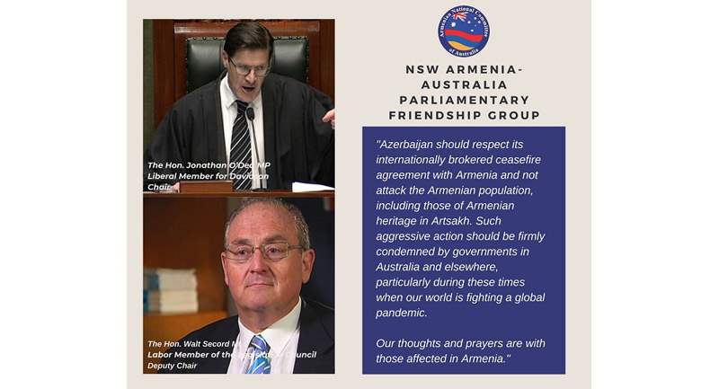 Աւստրալիոյ Նիւ Սաութ Ուէյլզ նահանգի խորհրդարանի Հայաստան-Աւստրալիա բարեկամական խումբը դատապարտեց Ազրպէյճանի սադրիչ գործողութիւնները հայ-ազրպէյճանական սահմանին վրայ: Այս մասին տեղեկացուց Աւստրալիոյ Հայ դատի յանձնախումբը: