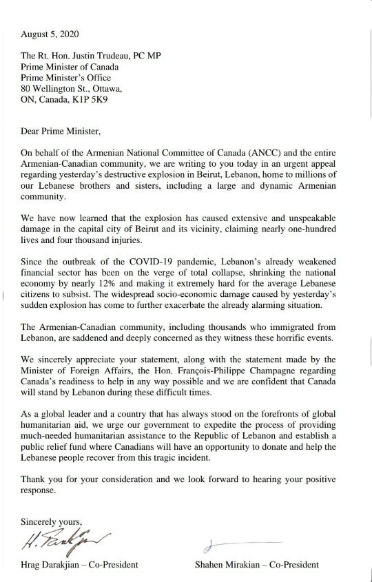 5 օգոստոս թուակիր նամակով մը, Քանատայի Հայ դատի յանձնախումբը նամակ յղեց Քանատայի վարչապետ Ճասթին Թրուտոյին` նամակին մէջ նշելով Քանատայի հայ համայնքի ակնկալութիւնը Քանատայի դաշնակցային կառավարութեան կողմէ Լիբանանի աղէտին առնչուող շտապ օժանդակութեան առնչութեամբ:
