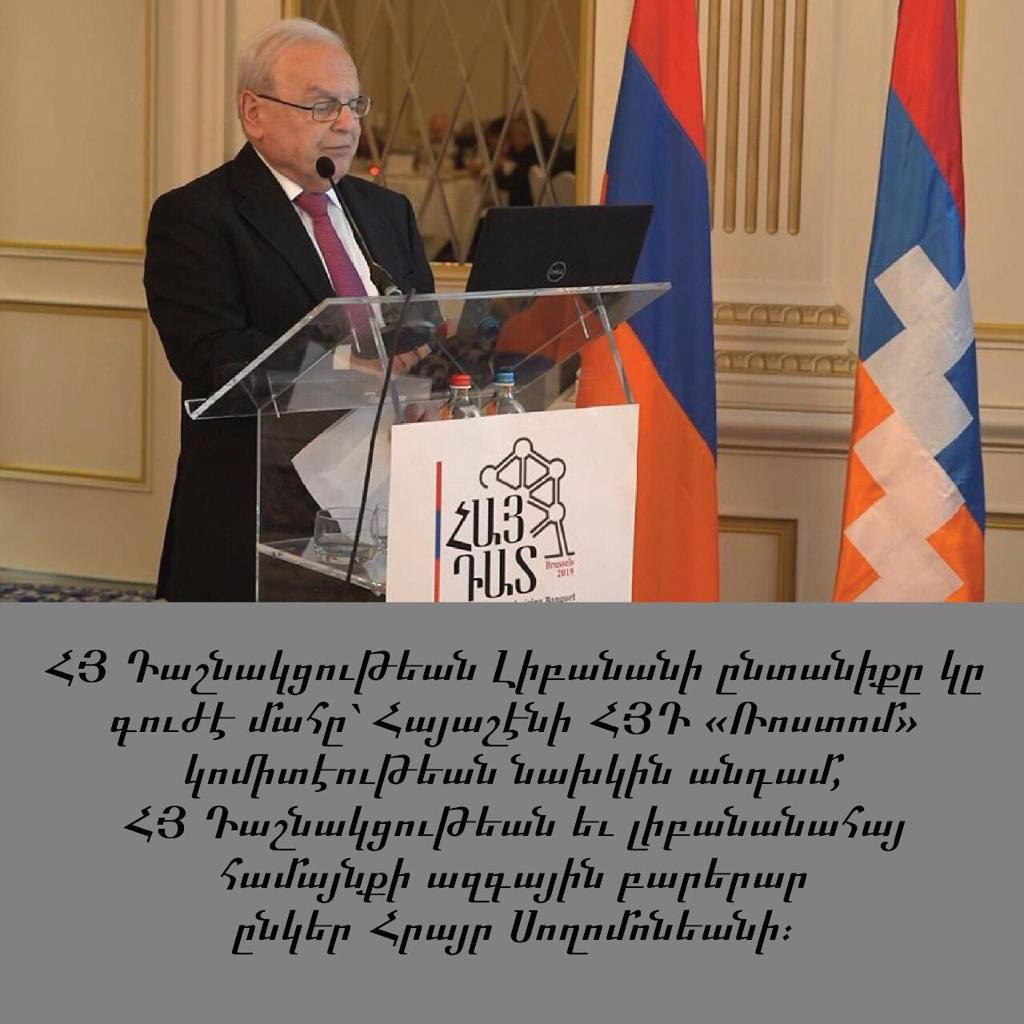 <a href="https://www.aztagdaily.com/wp-content/uploads/2020/10/hrayr-soghomonian_ARF.jpg"><img class="aligncenter size-full wp-image-485402" src="https://www.aztagdaily.com/wp-content/uploads/2020/10/hrayr-soghomonian_ARF.jpg" alt="" width="1024" height="1024" /></a> ՀՅ Դաշնակցութեան Լիբանանի ընտանիքը կը գուժէ Հայաշէնի ՀՅԴ «Ռոստոմ» կոմիտէութեան նախկին անդամ, ՀՅ Դաշնակցութեան եւ լիբանանահայ համայնքի ազգային բարերար <strong>ԸՆԿԵՐ ՀՐԱՅՐ ՍՈՂՈՄՈՆԵԱՆԻ </strong>մահը: